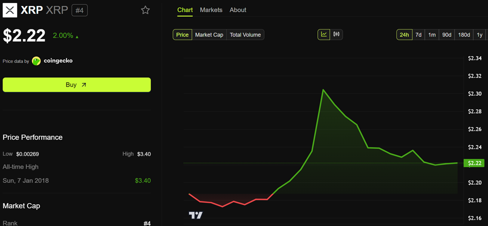Porém, apesar da movimentação no setor e dos rumores, o XRP teve variação limitada. O token subiu 2% nas últimas 24 horas e era negociado a US$ 2,22 no momento da publicação, segundo dados do BeInCrypto.