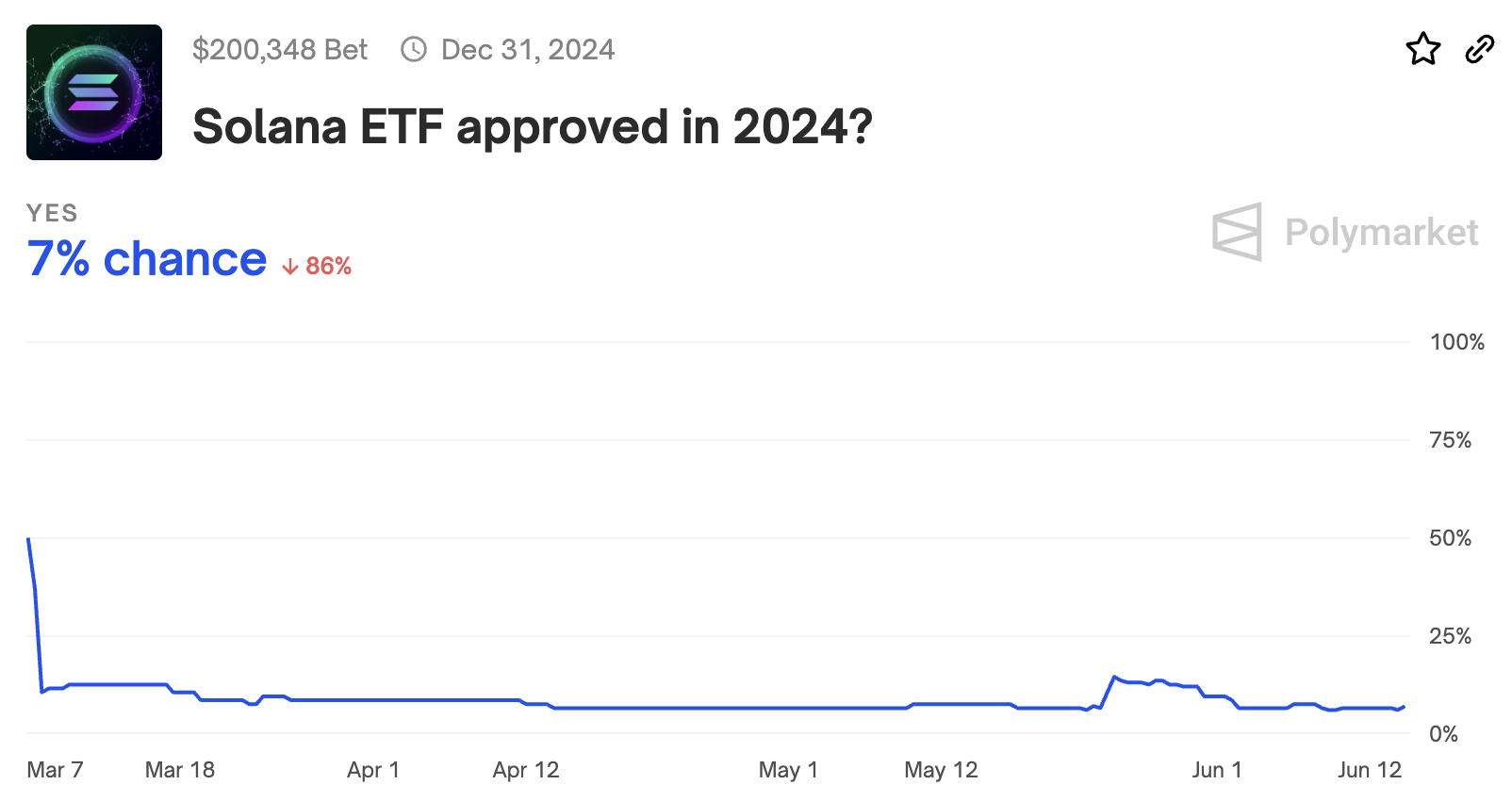 A plataforma de mercado de previsão descentralizada Polymarket registrou mais de US$ 200.000 em apostas sobre se os fundos negociados em bolsa (ETFs) de Solana à vista obterão aprovação até 31 de dezembro de 2024.