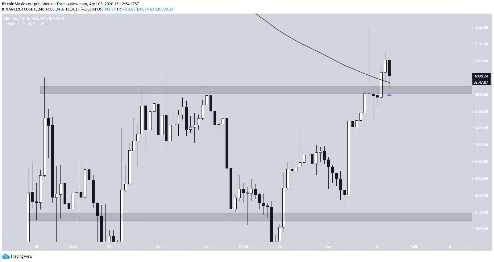No momento da redação deste artigo, o preço do BTC já havia ultrapassado essa média móvel (MA). Além disso, subiu acima da área de US $ 6.850 que anteriormente atuava como resistência e aparentemente está no processo de validá-la como suporte.