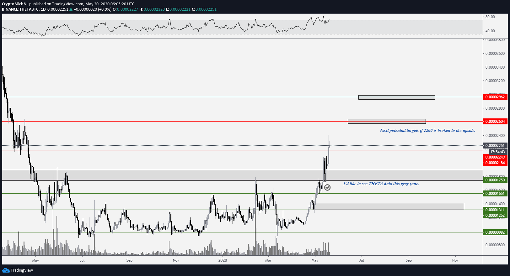 Outra moeda interessante para dar uma olhada é THETA. No entanto, ela já rompeu e ultrapassou o nível de resistência principal. @CryptoMichNL acredita que enquanto o nível de suporte atual de 1.800 permanecer, o preço provavelmente tentará 2.600 e, eventualmente, 3.000 satoshis.