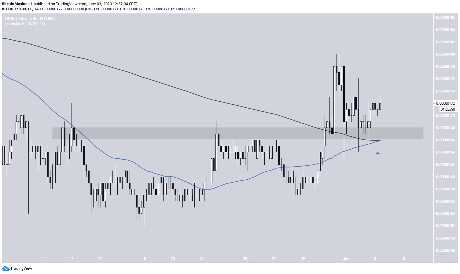 O gráfico de curto prazo suporta esse possível aumento. O TRX tornou com sucesso o nível de 168 satoshi um importante suporte e criou várias longas sombras inferiores.