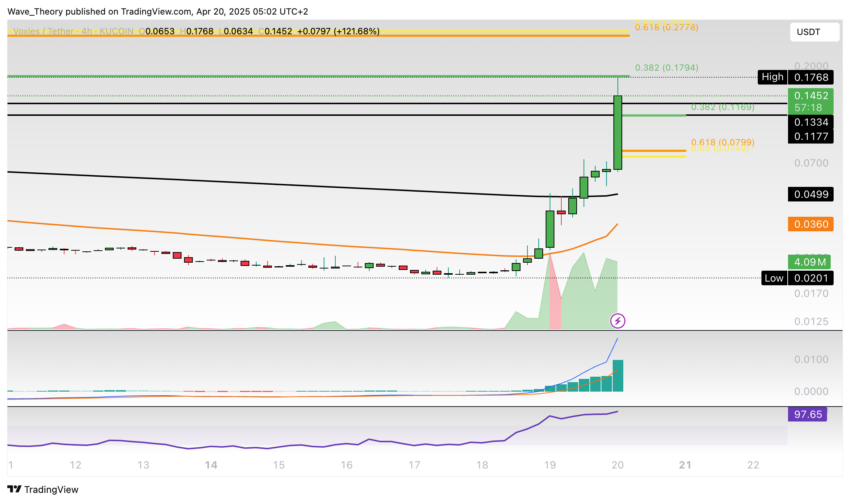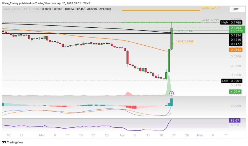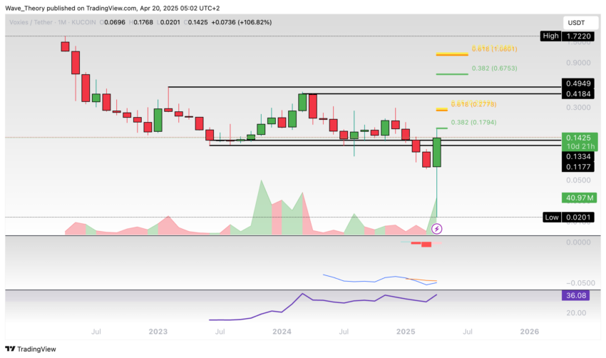 A VOXEL subiu cerca de 780% nesta semana, atingindo a resistência de Fibonacci de 0,382, em torno de US$ 0,18. Se quebrar essa resistência, o próximo alvo pode ser o nível da proporção áurea, perto de US$ 0,28.