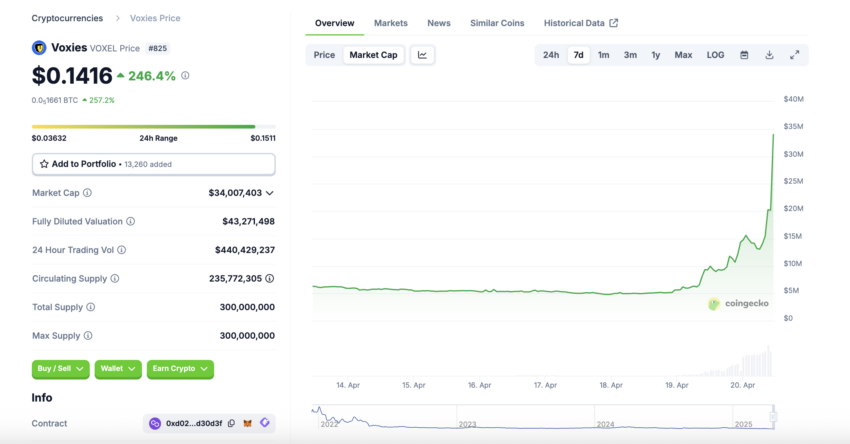 A Voxies (VOXEL) tem uma capitalização de mercado de cerca de US$ 34 milhões e ocupa o 825º lugar no ranking da Coingecko. Apesar da alta recente, a moeda ainda é muito pequena.