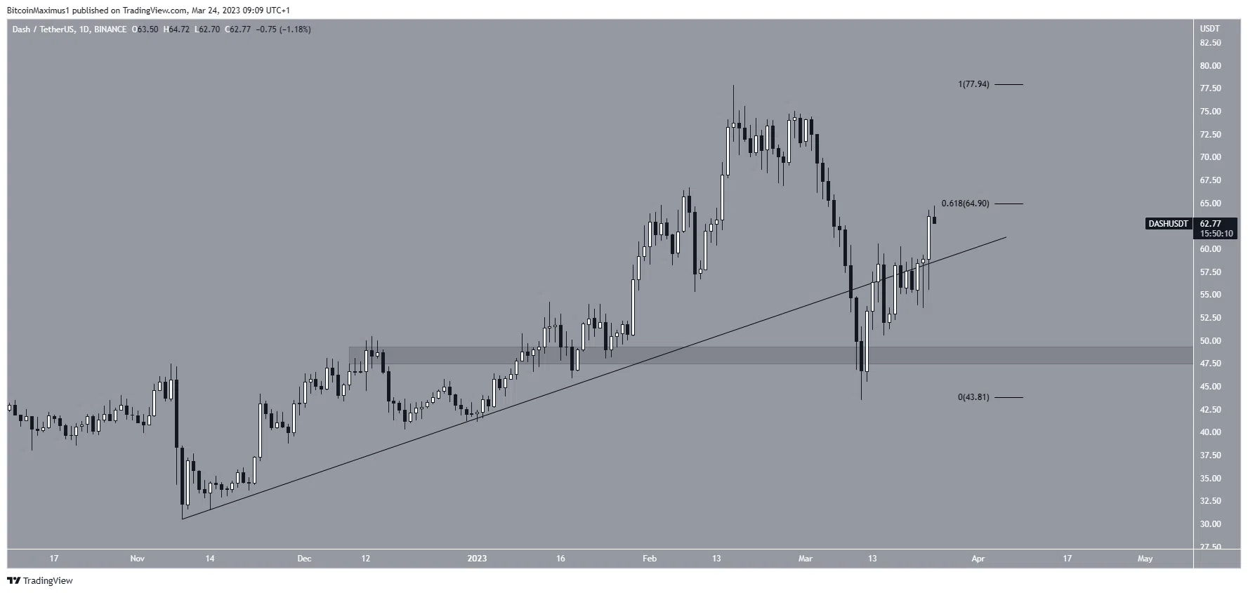A Dash (DASH) saltou na área de suporte de US$ 48 em 14 de março, iniciando o atual movimento ascendente. Ela recuperou uma linha de suporte ascendente em 23 de março.