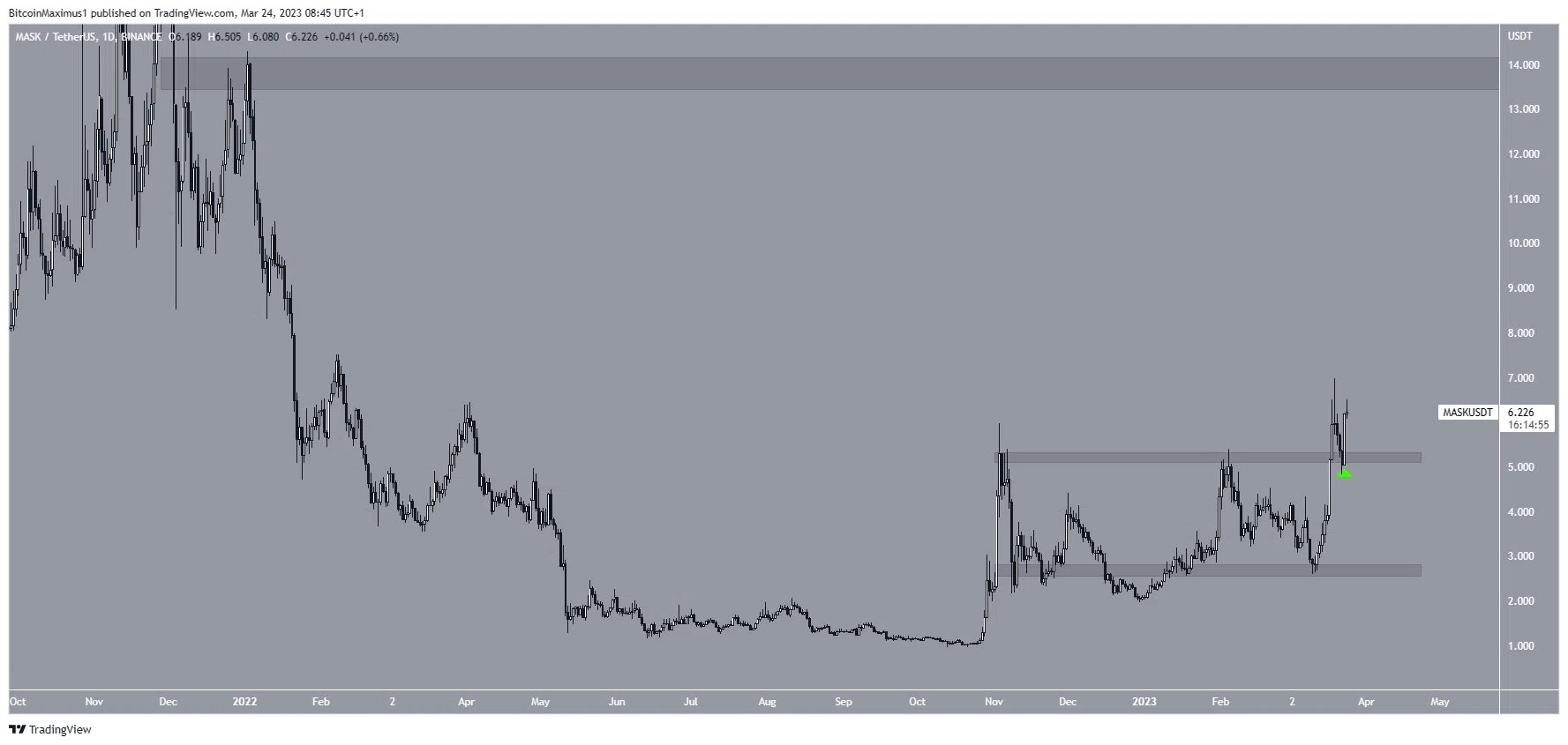 A MASK aumentou acentuadamente desde novembro de 2022. Embora a recuperação tenha parado abaixo da área de resistência de US$ 5,95, o preço finalmente saiu dela. Atualmente está em processo de validação como resistência. Se o aumento continuar, a área de resistência mais próxima seria de US$ 13,80.