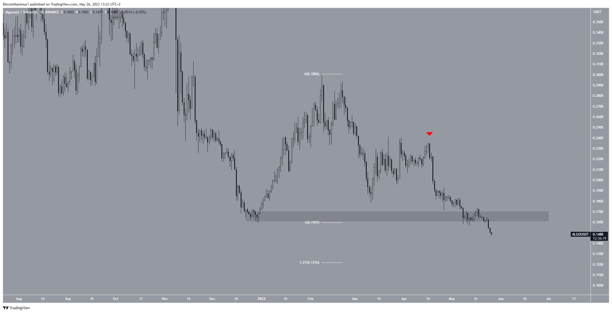 A ALGO caiu a um ritmo acelerado desde a criação de uma mínima mais alta em 17 de abril (ícone vermelho). No início de maio, o ativo saltou na área de suporte horizontal de US$ 0,160.