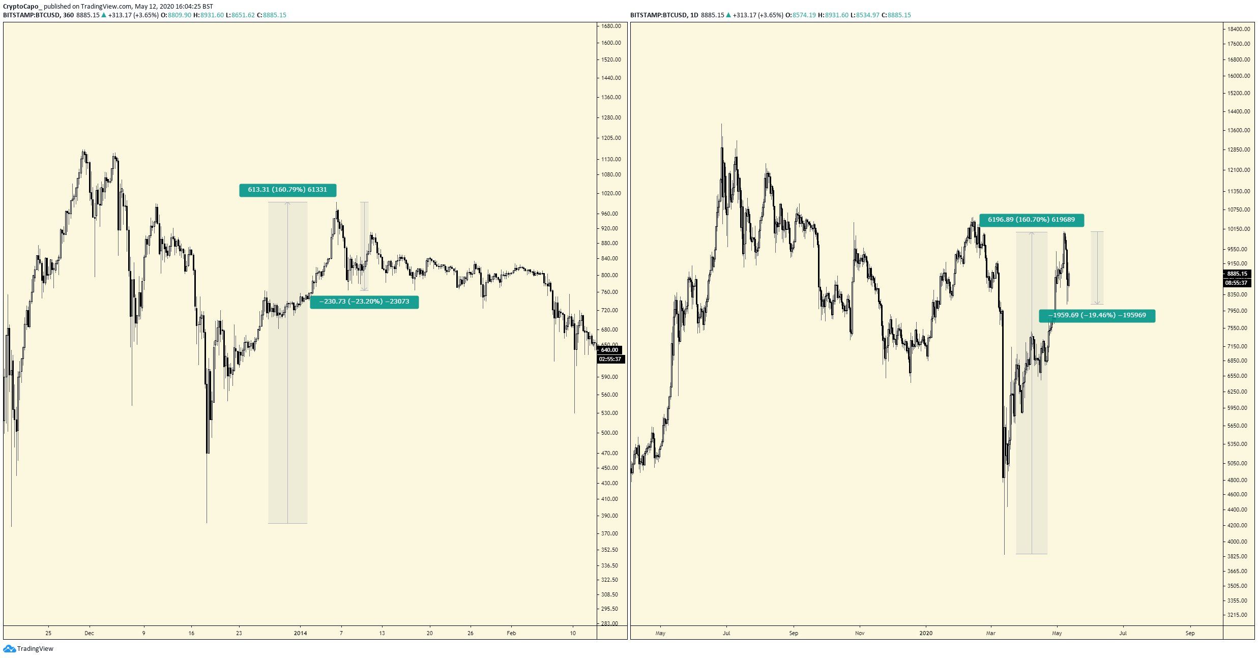 Em 7 de maio, o preço do Bitcoin atingiu uma alta de US $ 10.067 e iniciou uma queda acentuada. O movimento dos preços em torno dessa queda é muito semelhante ao de janeiro de 2014.