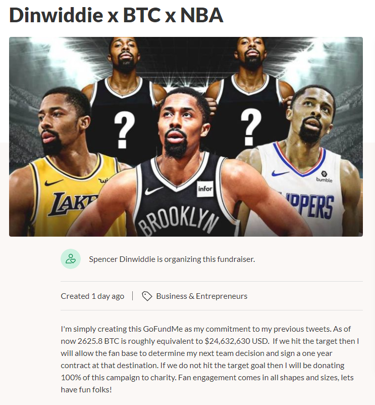 Dinwiddie, que é conhecido na esfera de criptomoedas por ter tentando tokenizar seu contrato com a NBA, prometeu deixar seus fãs decidirem com qual time ele assinará um contrato de um ano, se puderem alcançar seu ambicioso objetivo de captação de recursos. Caso contrário, quaisquer fundos que ele levantar serão doados para caridade. De acordo com Yahoo Sports , Dinwiddie é elegível para ser um agente livre após a temporada 2020-2021.