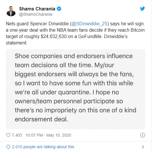 O jogador da NBA Spencer Dinwiddie quer que seus fãs coloquem seu Bitcoin onde estão sua boca. O armador do Brooklyn Nets lançou uma página do GoFundMe na qual ele pretende levantar 2.625,8 BTC, ou aproximadamente US $ 24.632.630, de seus fãs durante a quarentena.