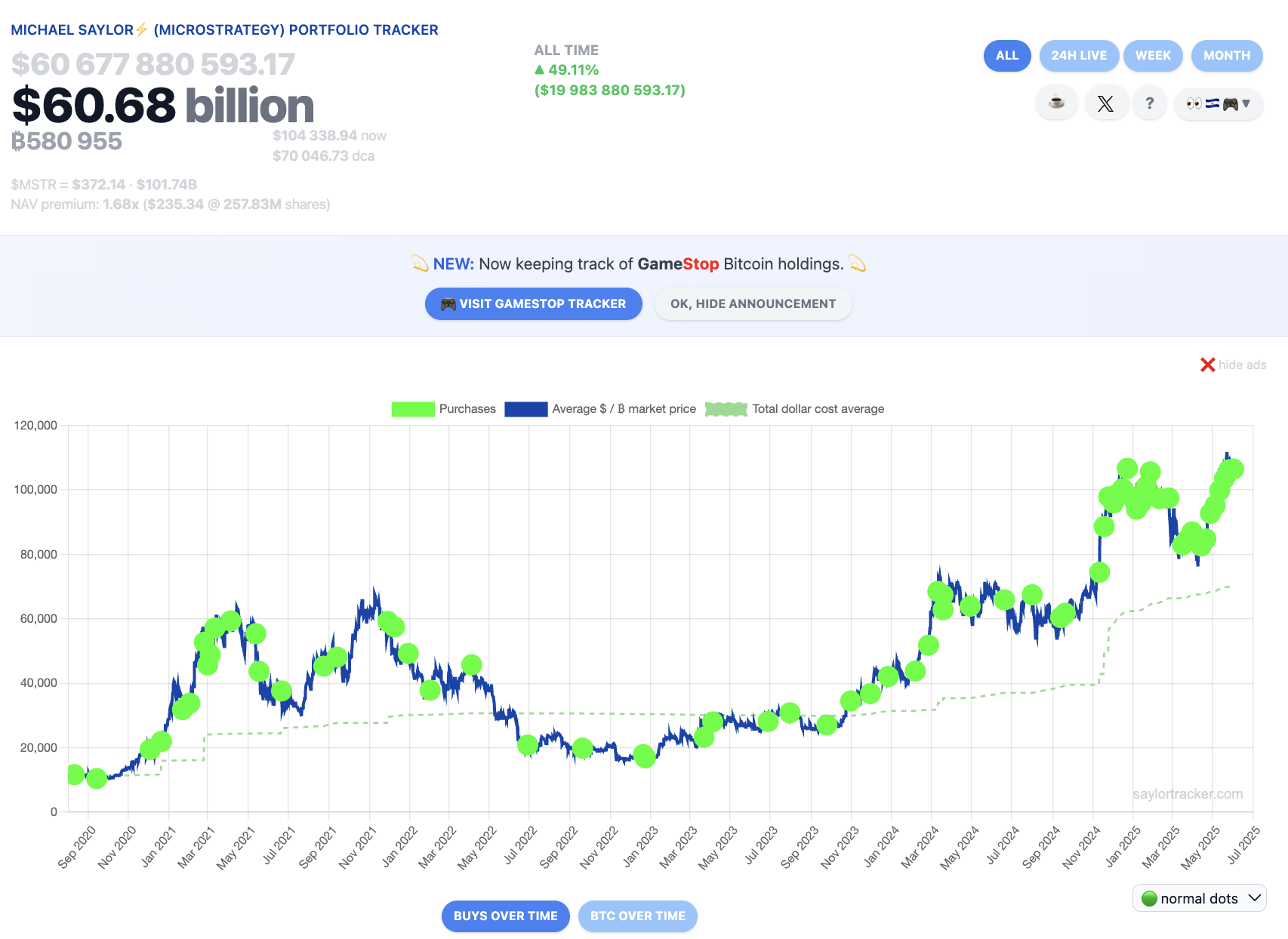 SponsoredAlém disso, a empresa efetuou sua última aquisição ao valor de US$ 106.495 por BTC, com retorno de 16,9%. A Strategy tem mantido compras semanais de Bitcoin ao longo dos últimos meses. Em 1º de junho de 2025, os investimentos em BTC totalizavam US$ 40,68 bilhões, com preço médio de US$ 70.023 por unidade.