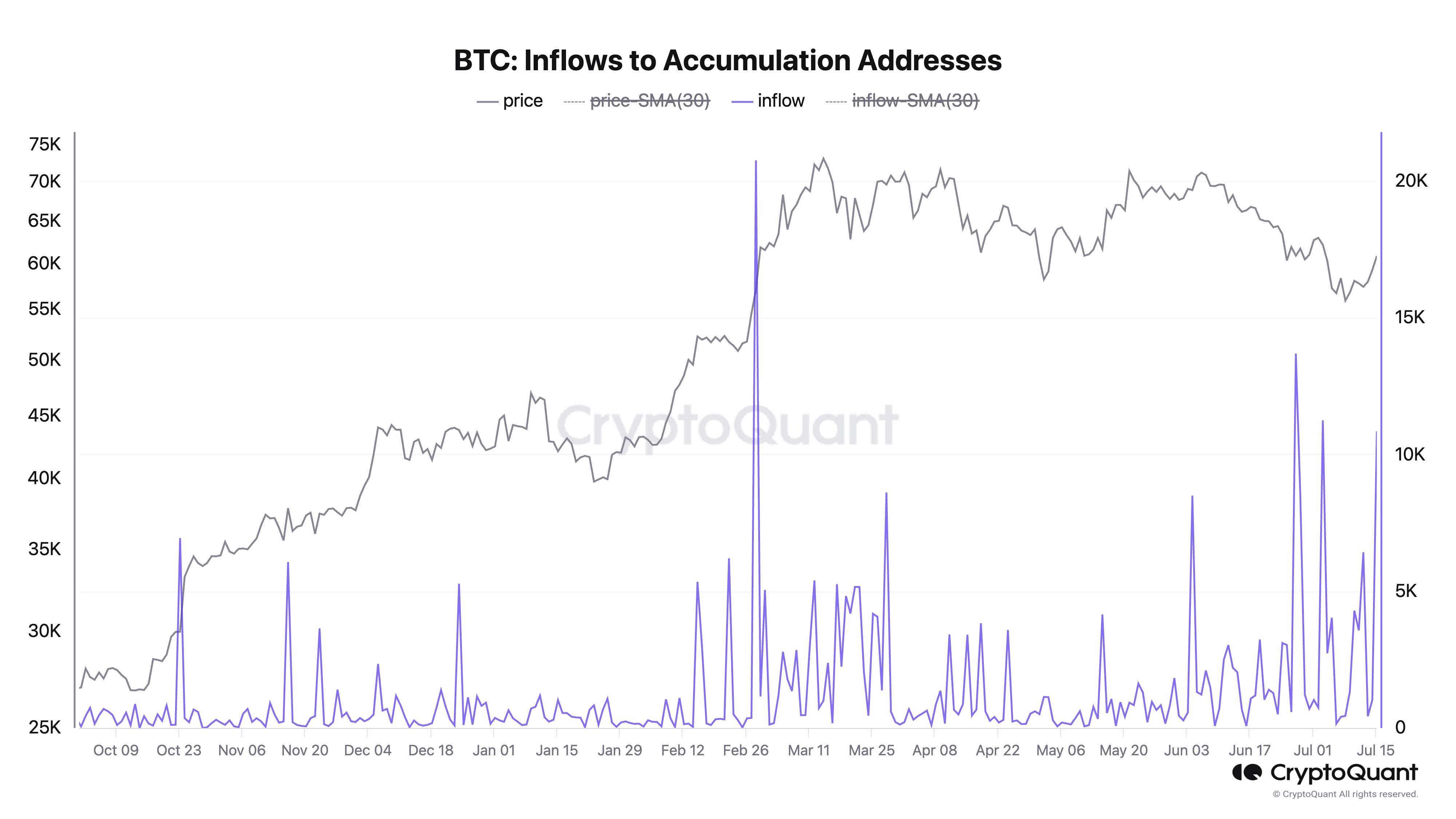 Enquanto isso, as baleias de cripto também estiveram ativas, acumulando quantidades significativas de BTC. No dia 15 de julho, dados da CryptoQuant mostraram que os endereços de acumulação de Bitcoin receberam aproximadamente 10.800 BTC, cerca de US$ 656,64 milhões.