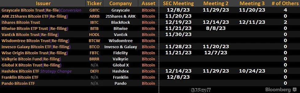 Na terça-feira, a BlackRock teve outra reunião com a SEC dos EUA. Isso eleva para 24 o número total de reuniões oficiais da agência entre os atuais solicitantes de ETFs de Bitcoin, observou James Seyffart, analista da Bloomberg.