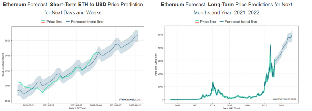 De acordo com a análise AI da WalletInvestor, a projeção de preços da ETH é otimista para as próximas semanas e meses. A previsão prevê um preço máximo ETH para o final de agosto de 2021 de US$ 3.657.620 a US$ 3.849.470.