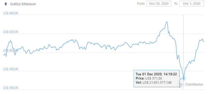Por enquanto, a moeda passa por alta volatilidade. Nas últimas 24 horas, a ETH chegou a subir 3,77%, de cerca de US$ 609 para US$ 632. Em poucas horas, no entanto, o preço recuou 9,65% para US$ 571 e logo recuperou. Às 12h09, era negociada na casa dos US$ 605, segundo o Coingecko.