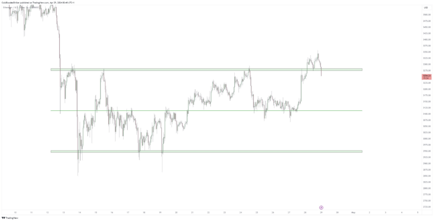 O gráfico de ColdBloodShill mostra como o ETH não conseguiu manter o suporte principal e, essencialmente, transformou-o novamente em resistência. O gráfico indica novamente um potencial de queda maior para a área de US$ 3.100.