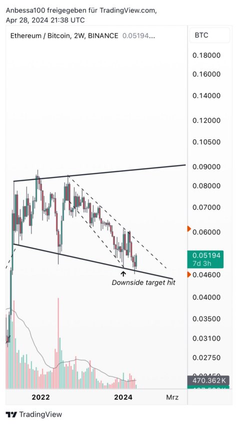 Além disso, o trader afirmou que, embora a meta de queda do ETH/BTC tenha sido atingida, ele poderia testar novamente o suporte antes de realizar novos saltos.