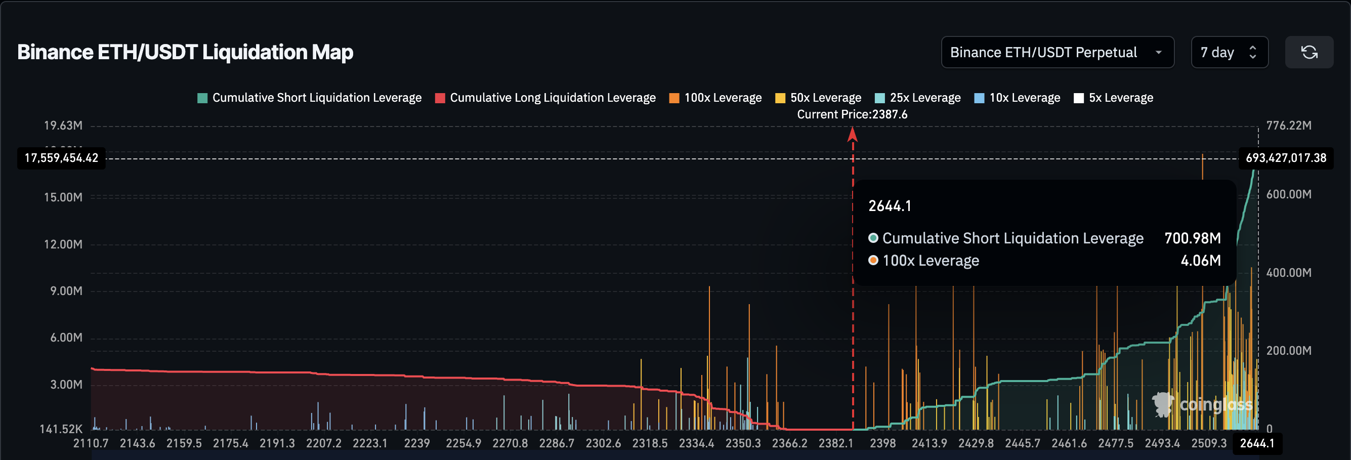 Esse comportamento pode ser crucial para ajudar a criptomoeda a se recuperar e potencialmente apagar algumas de suas perdas recentes. Se isso continuar, o preço do ETH poderia saltar para US$ 2.600. Segundo a Coinglass, um aumento para US$ 2.644 poderia provocar mais de US$ 700 milhões em liquidações de posições contrarias.