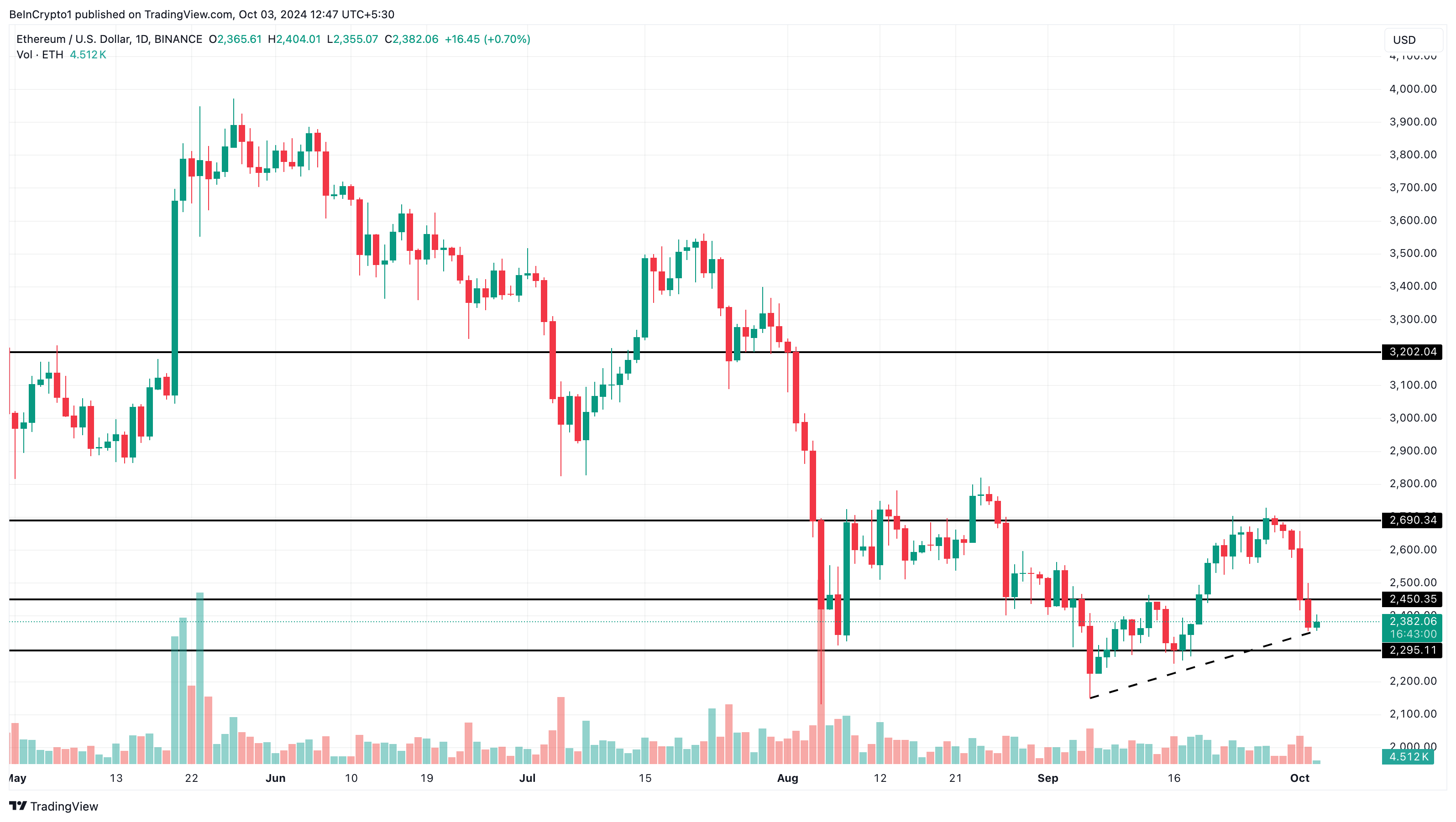 Contudo, é importante notar que é necessária uma pressão de compra significativa para concretizar essa previsão. Pelo gráfico diário abaixo, o preço do Ethereum pode subir para US$ 2.450 se a linha de tendência de alta se mantiver.
