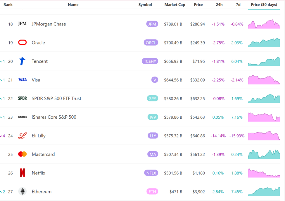 A capitalização de mercado do Ethereum subiu para US$ 471 bilhões, superando grandes corporações globais e alcançando a 27ª posição entre todos os ativos.