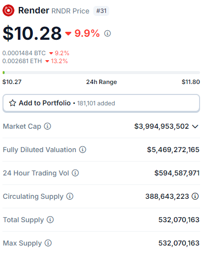 Ao contrário da Bonk, a Render tem tido o pior desempenho em todo o mercado ao cerca de 10% no dia. Apesar disso, a altcoin manteve o suporte de US$ 10.