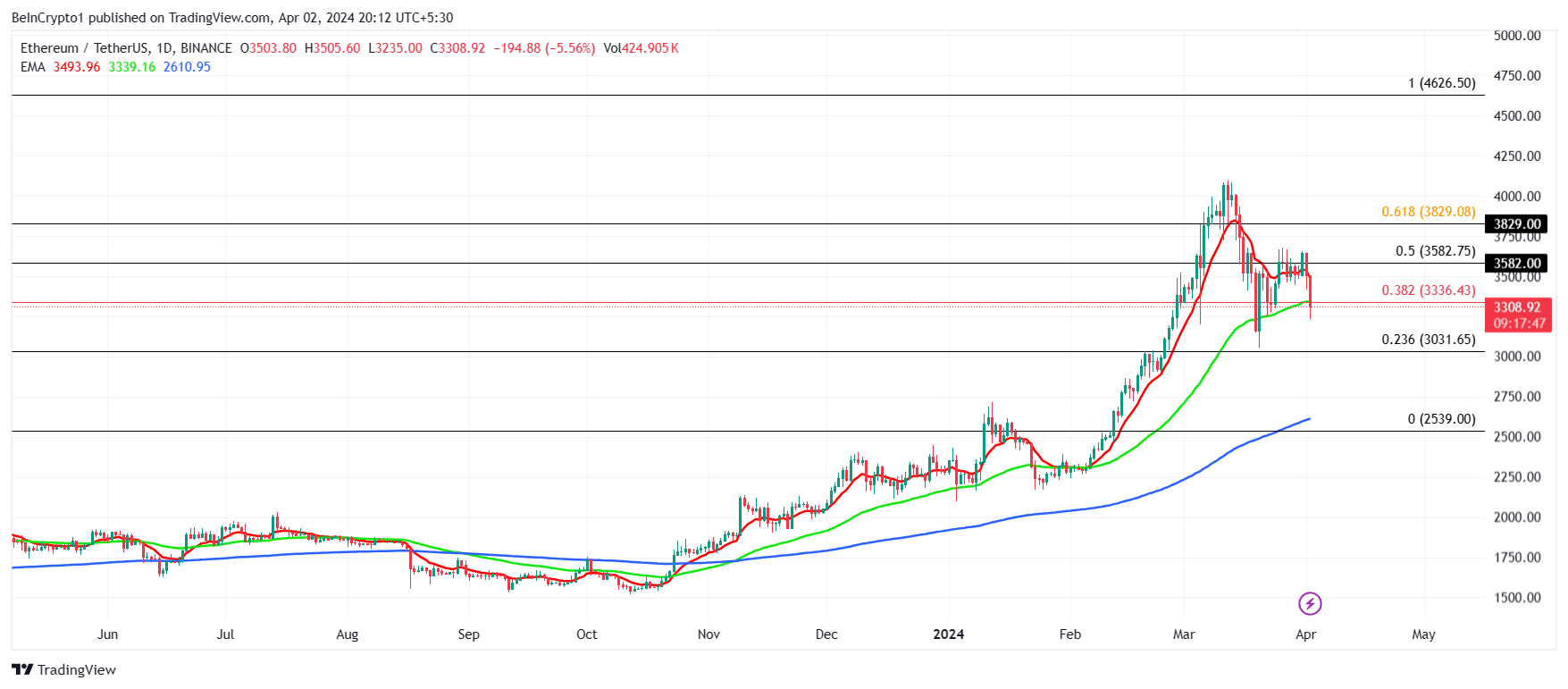 O preço do Ethereum, negociado a US$ 3.308, já perdeu o suporte das médias móveis exponenciais (EMA) de 50 e 100 dias e também está abaixo da linha de suporte de US$ 3.336. Isso deixa o ETH altamente vulnerável a testar o próximo ponto de preço crucial como suporte, que é de US$ 3.031.