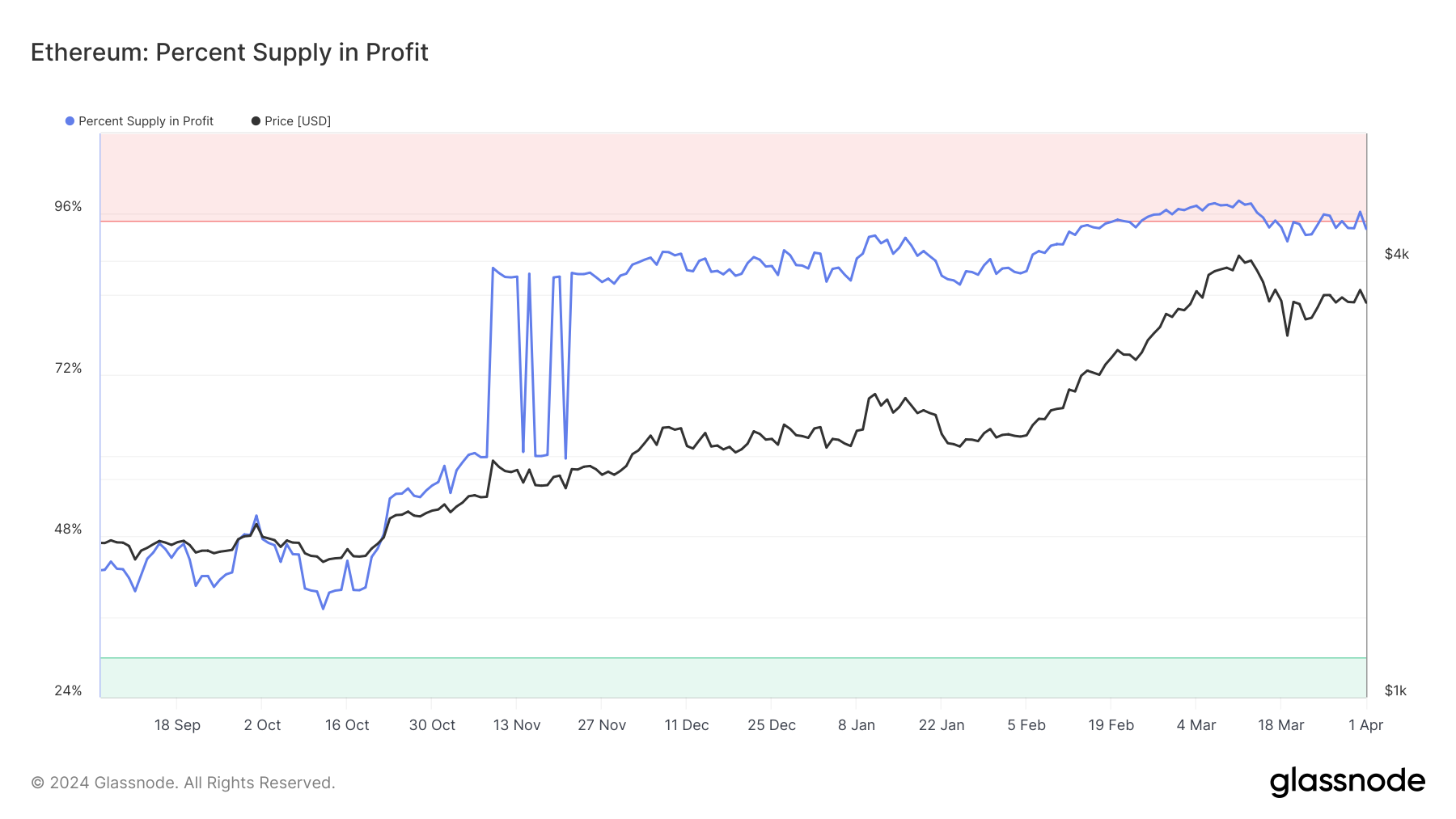Apesar da queda, o preço do Ethereum quase recuperou US$ 3.500 como piso de suporte antes de falhar. Isso resultou em lucros para os investidores em criptomoedas. No momento, mais de 96% de toda a oferta está em lucros.