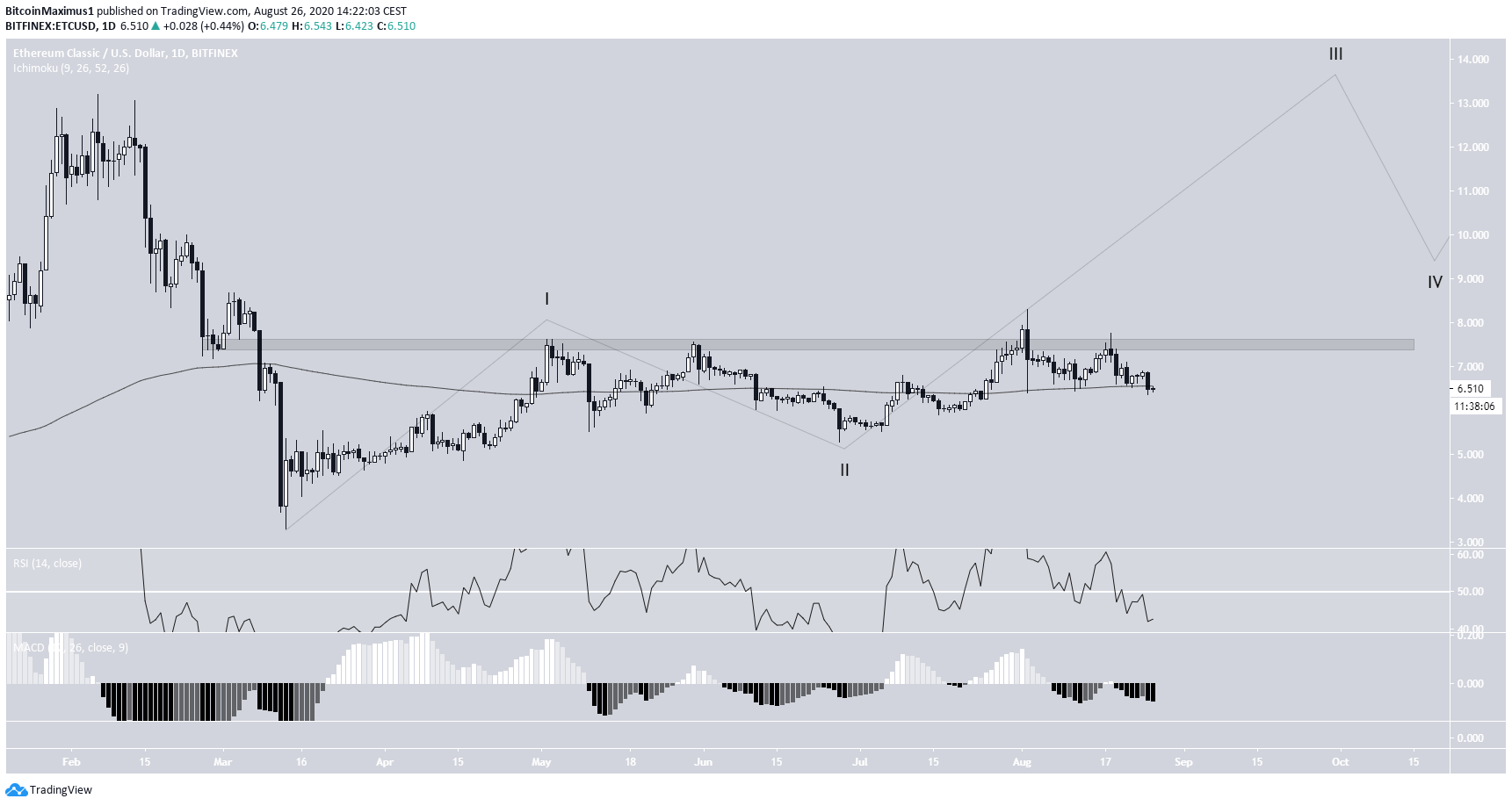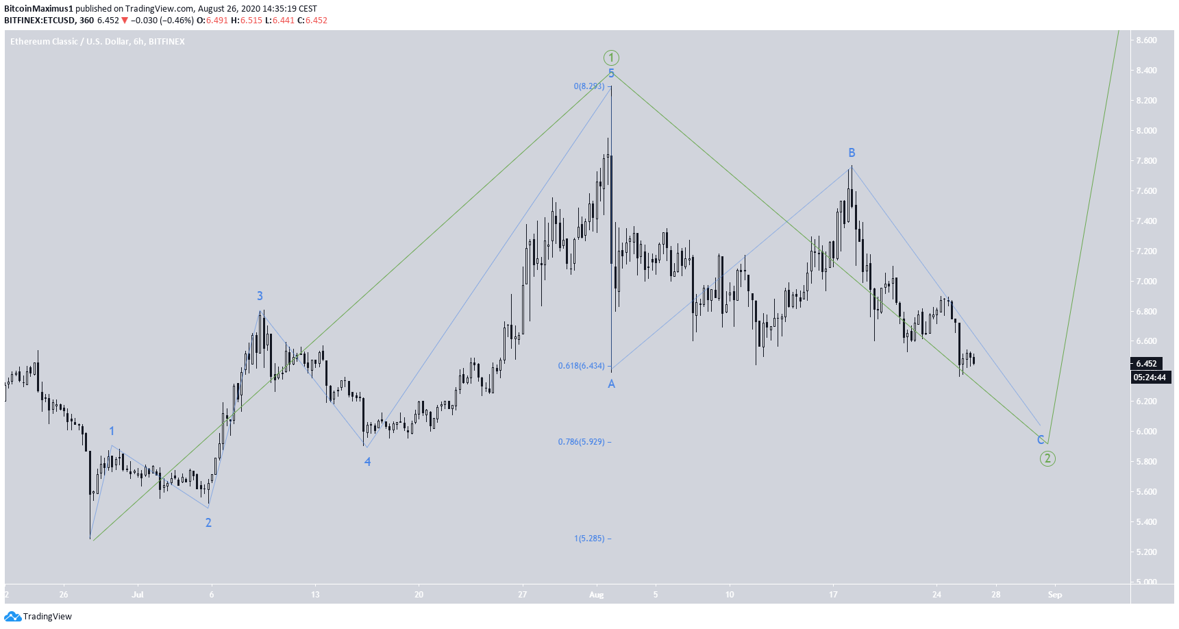 Desde março, o preço da ETC provavelmente começou uma formação impulsiva de cinco ondas (em preto abaixo), atualmente sendo negociada na terceira onda. Um rompimento acima de $ 7,50 confirmaria que o preço está em uma tendência de alta.