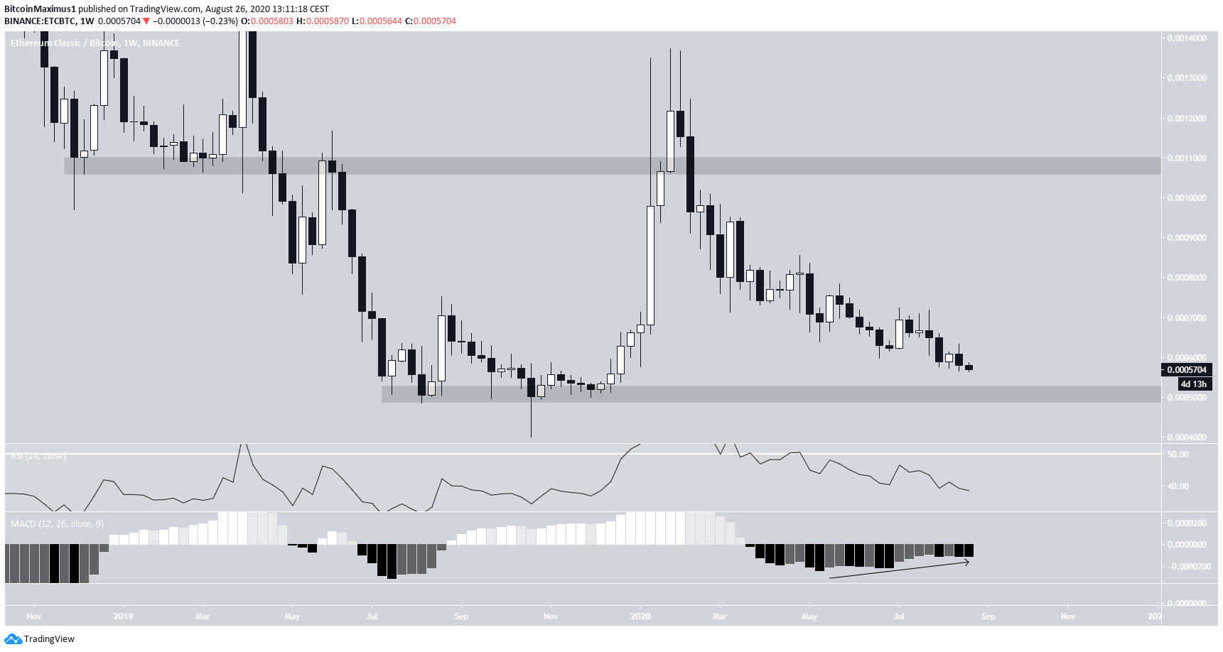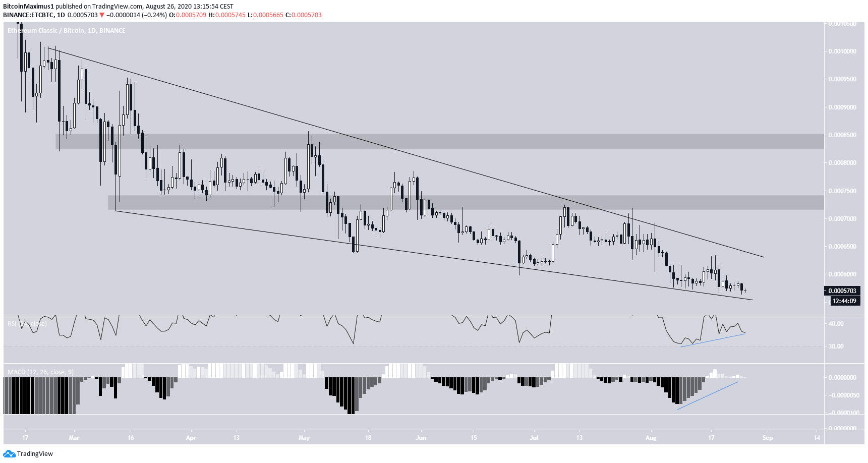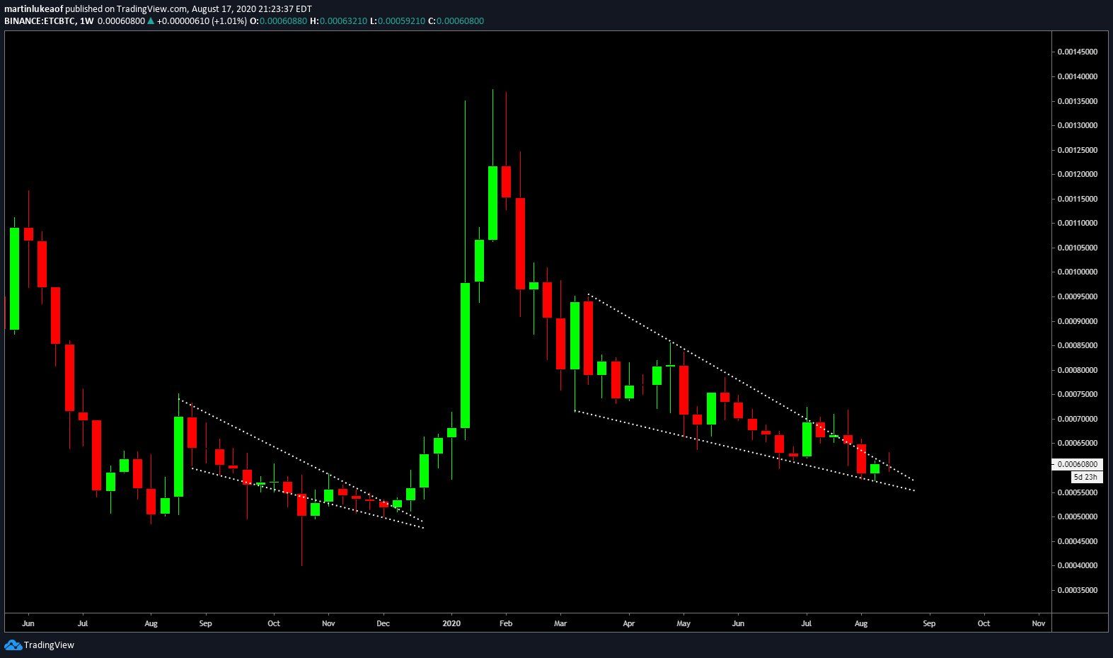 O preço da ETC começou um movimento ascendente em setembro de 2019, que acabou levando a uma alta de 137.360 satoshis no dia 29 de janeiro de 2020. Este movimento causou um rompimento na área de 110.000 satoshi, que anteriormente atuava como suporte e era esperado que agisse como resistência depois.