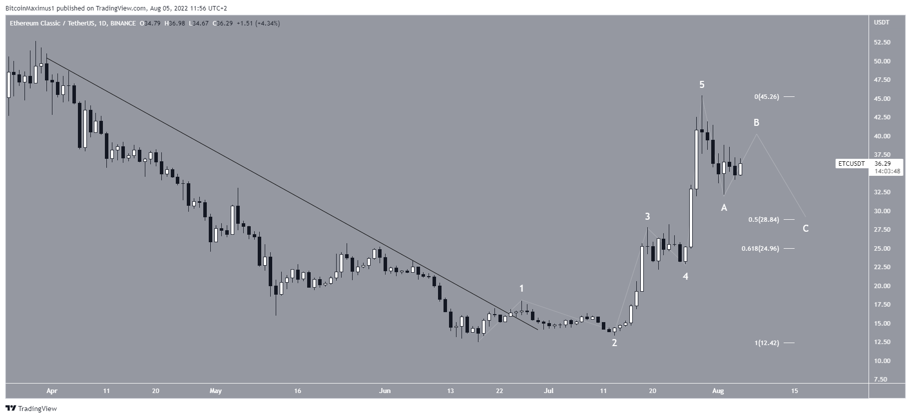 Da mesma forma que o BTG, o ETC saiu de uma linha de resistência descendente em 24 de junho. Ele aumentou rapidamente depois e atingiu uma alta de US$ 45,36 em 29 de julho.