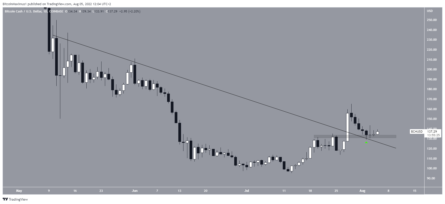 O BCH vem aumentando desde 13 de julho e saiu de uma linha de resistência descendente em 28 de julho. E voltou a validar a linha como suporte cinco dias depois (ícone verde). O salto também coincidiu com uma validação da área de suporte horizontal de US$ 133.