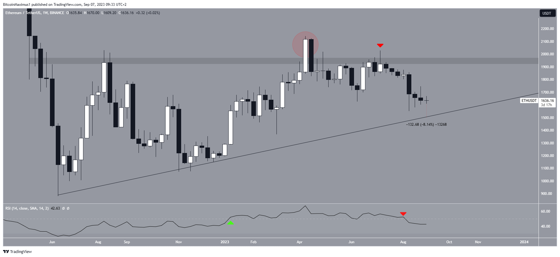 A análise técnica do gráfico semanal é pessimista devido à ação do preço e às leituras do RSI. O preço do ETH desviou acima da área de resistência horizontal de US$ 1.950 no início de abril (círculo vermelho). Depois, caiu abaixo desse nível e o validou a área como resistência em julho (ícone vermelho).