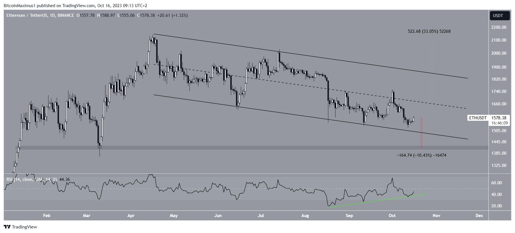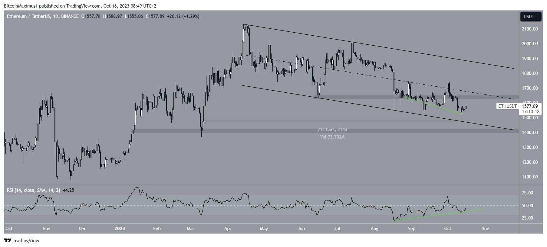 O gráfico diário mostra que o ETH está dentro de um canal paralelo de baixa desde abril. A queda causou um rompimento da área de suporte horizontal de US$ 1.650 e levou a uma mínima de US$ 1.521 em 12 de outubro. Este foi o preço mais baixo em 214 dias.