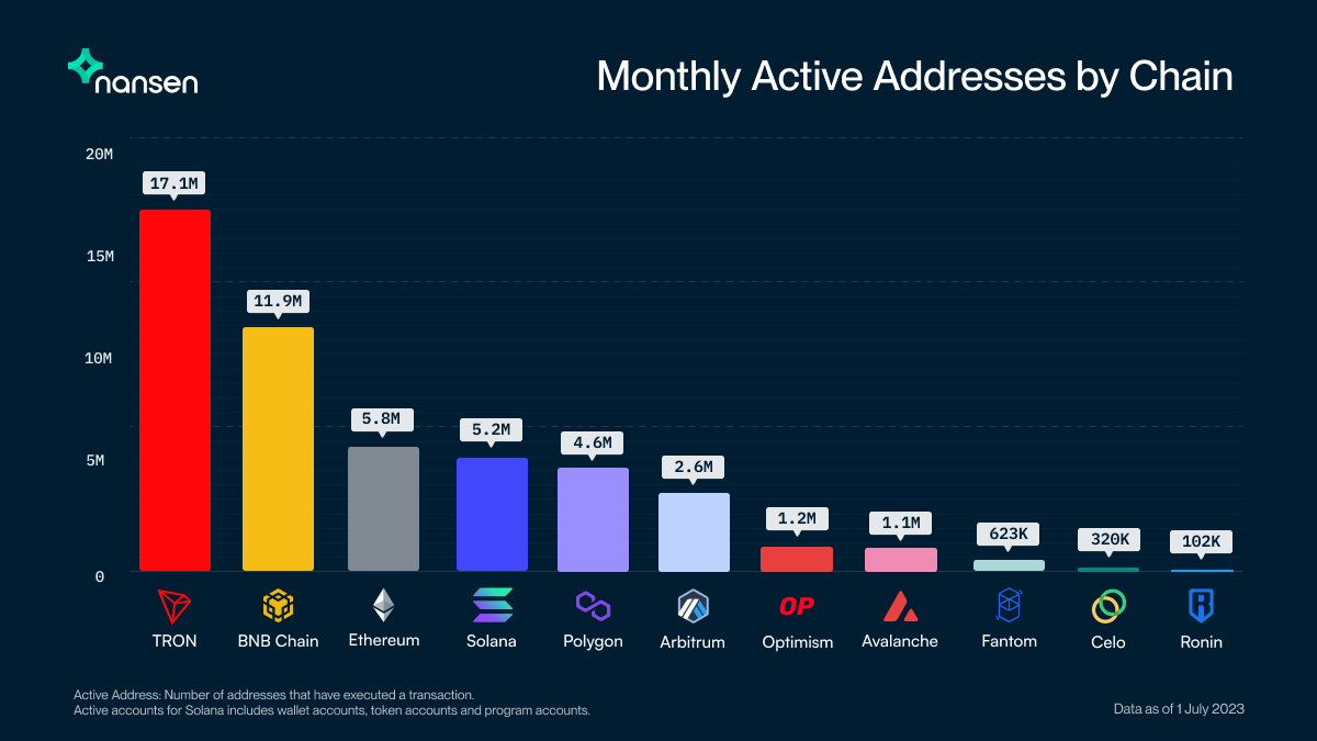 O gráfico mostra que os endereços ativos mensais da TRON (TRX) cresceram 42%, atingindo 17,1 milhões em junho. E, apesar do sentimento negativo causado pelo processo da SEC dos EUA contra a Binance, a tração mensal da BNB Chain (BNB) caiu apenas 4%, atingindo 11,9 milhões de endereços ativos.