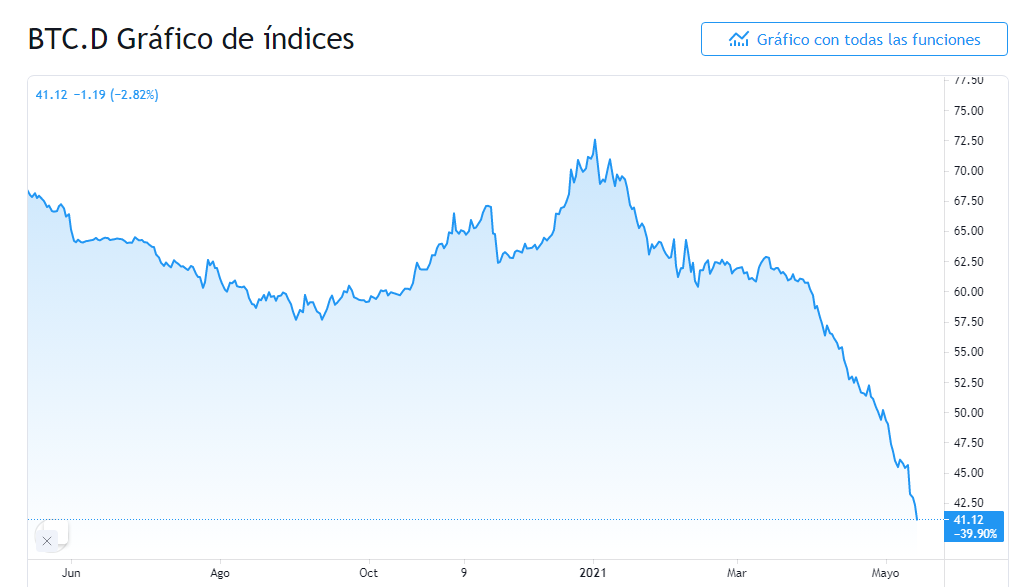 Outro elemento que é importante destacar é que a relação entre as duas criptomoedas atingiu 0,08, enquanto a taxa de dominância do Bitcoin (BTCD) caiu quase 41%.