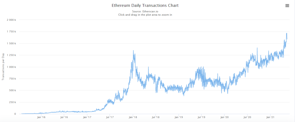 Além disso, existe uma métrica em que a Ethereum já até mesmo superou o Bitcoin: o número de transações diárias. No fechamento da matéria, a Ethereum registrava cerca de 1,5 milhão de transações diárias, enquanto o Bitcoin alcançou pouco mais de 250 mil no mesmo período.
