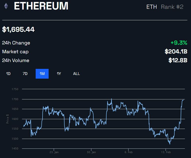 O preço do Ethereum atingiu US$ 1.700 algumas horas atrás durante o pregão da manhã de quinta-feira. O ativo está mostrando um ganho de 9,3% no dia. No entanto, existe forte resistência neste nível.