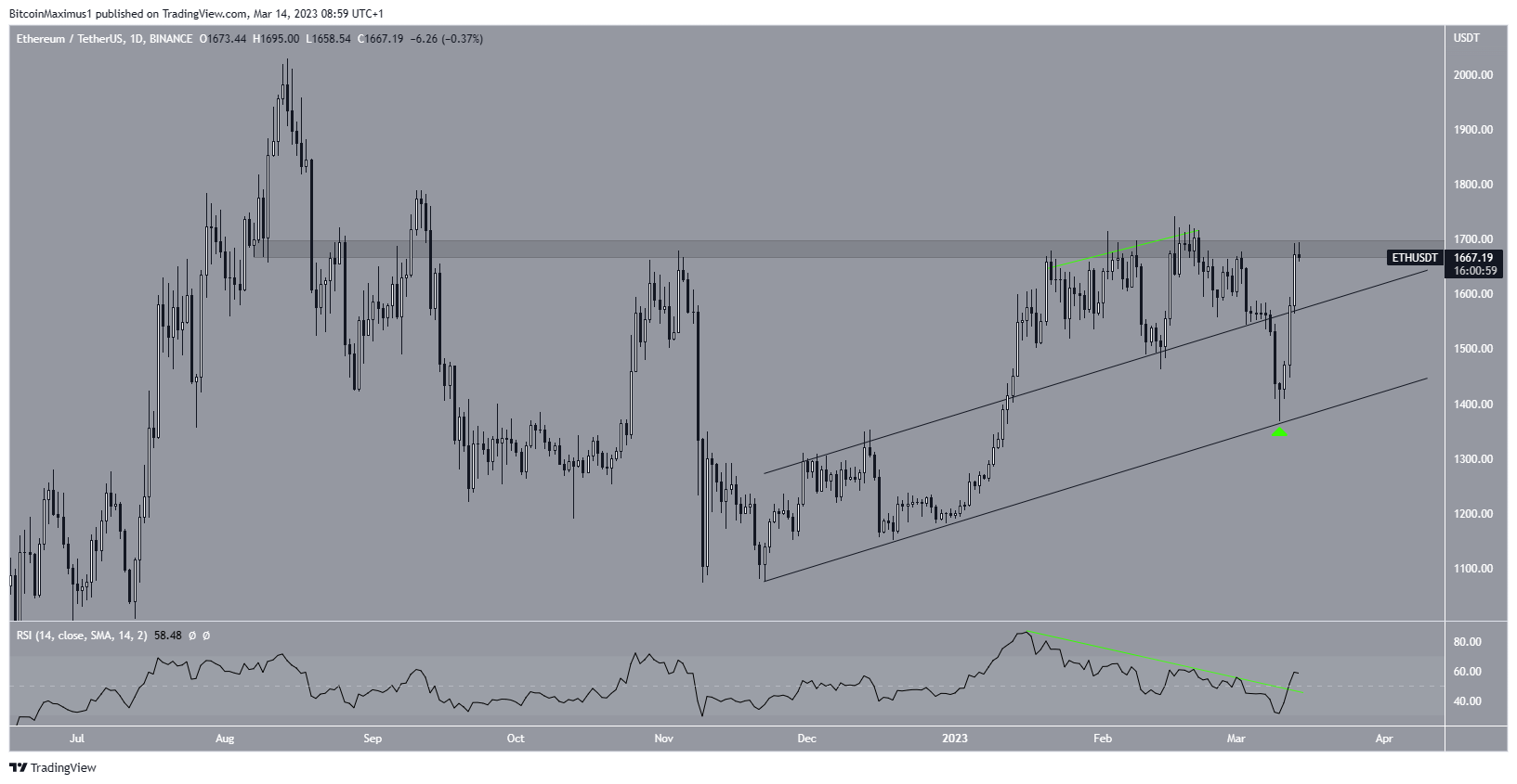 A análise técnica do gráfico semanal fornece uma perspectiva otimista para o ETH. A principal razão para isso é a reação à área horizontal de US$ 1.400. A área atuou como a alta histórica desde 2018 e foi respeitada apesar de dois desvios em 2022 (círculos vermelhos).