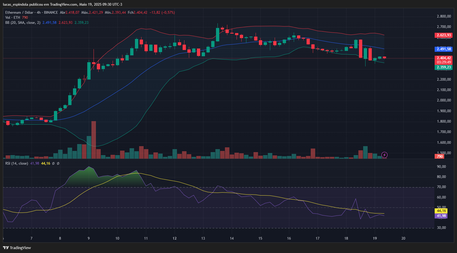 O Ethereum (ETH) segue em movimento corretivo após atingir a máxima mensal na primeira quinzena de maio. No gráfico de 4 horas, é possível observar que o preço se encontra abaixo da média central das Bandas de Bollinger, o que indica tendência de baixa no curto prazo.
