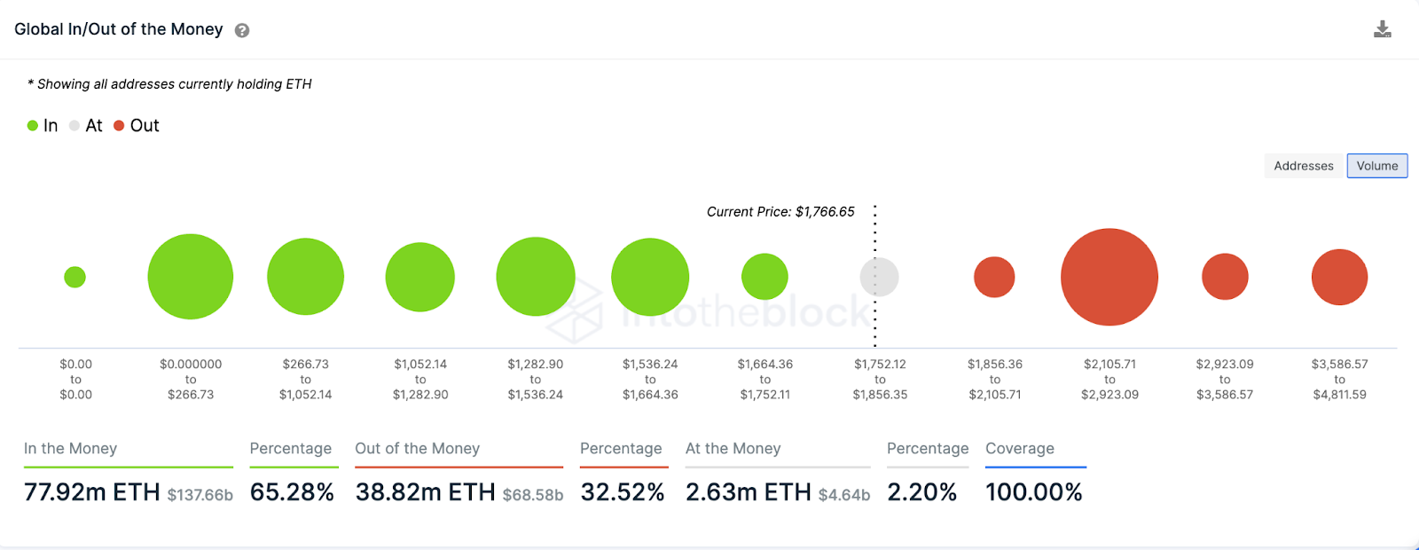 Os dados do In/Out of the Money (GIOM) do IntoTheBlock fornecem informações sobre o potencial desempenho de preço do ETH. Ele rastreia a distribuição de preços dos detentores de tokens com base no volume de tokens mantidos em cada endereço.