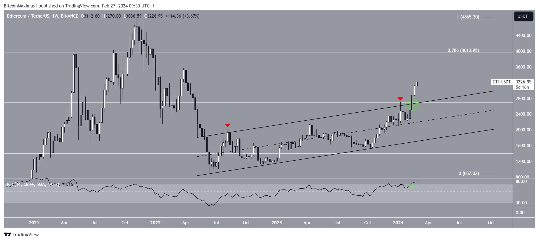 A análise técnica do gráfco semanal mostra que o Ethereum subiu rapidamente nas últimas cinco semanas. Nas últimas 24 horas, atingiu a máxima de US$ 3.270, seu maior valor desde março de 2022.