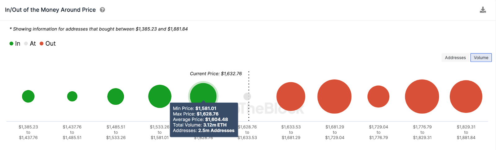 Com base nos dados on-chain e do mercado de derivativos analisados acima, o preço do Ethereum provavelmente perderá o suporte de US$ 1.600 nos próximos dias. O In/Out of Money Around Price, que mostra a distribuição do preço de entrada dos atuais detentores, também validam esta previsão.