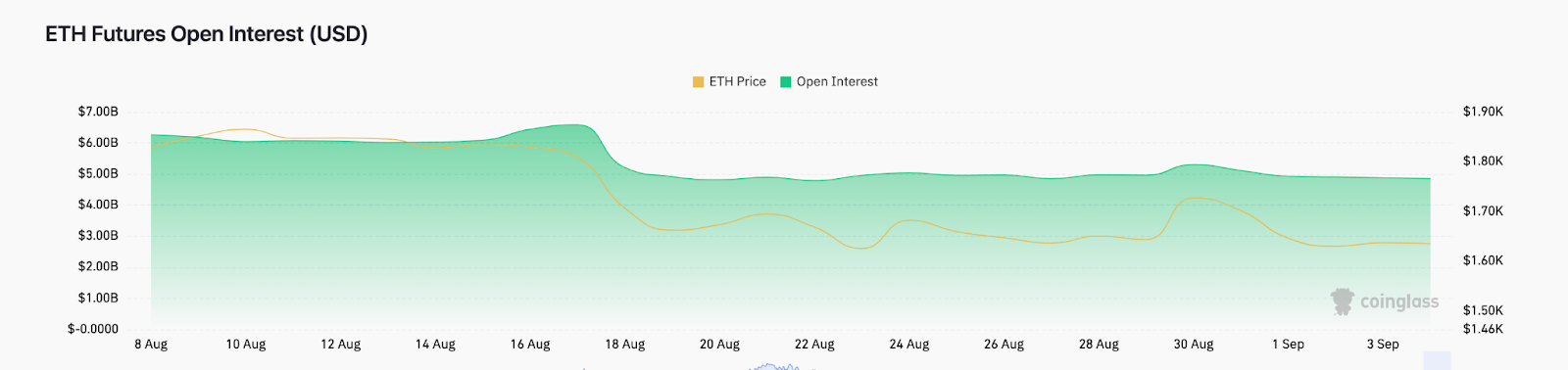 Dados do mercado de derivativos mostram que os juros em aberto caíram para US$ 4,86 bilhões em 4 de setembro. Notadamente, a última vez que caiu para esse nível foi durante o pânico desencadeado pela queda de preço do USDC e a falência do Silicon Valley Bank em março.