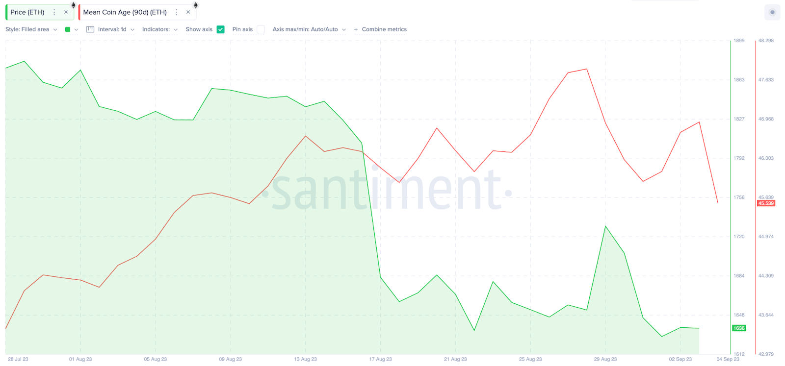 Uma tendência de baixa normalmente significa que muitas moedas de longa data foram movimentadas ou vendidas durante esse período. O gráfico acima estabelece uma estreita correlação entre os topos do Mean Coin Age e as recentes correções de preços do ETH, especialmente por volta de 18 e 29 de agosto.