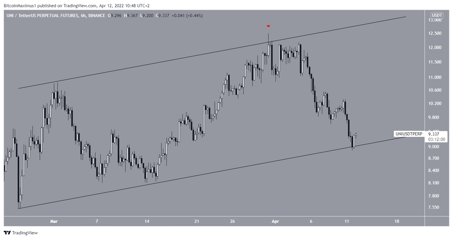 O preço da UNI está subindo dentro de um canal paralelo de alta desde 24 de fevereiro. Porém, ele não conseguiu ultrapassar a linha de resistência desse padrão gráfico em 31 de março (ícone vermelho) e vem caindo desde então.