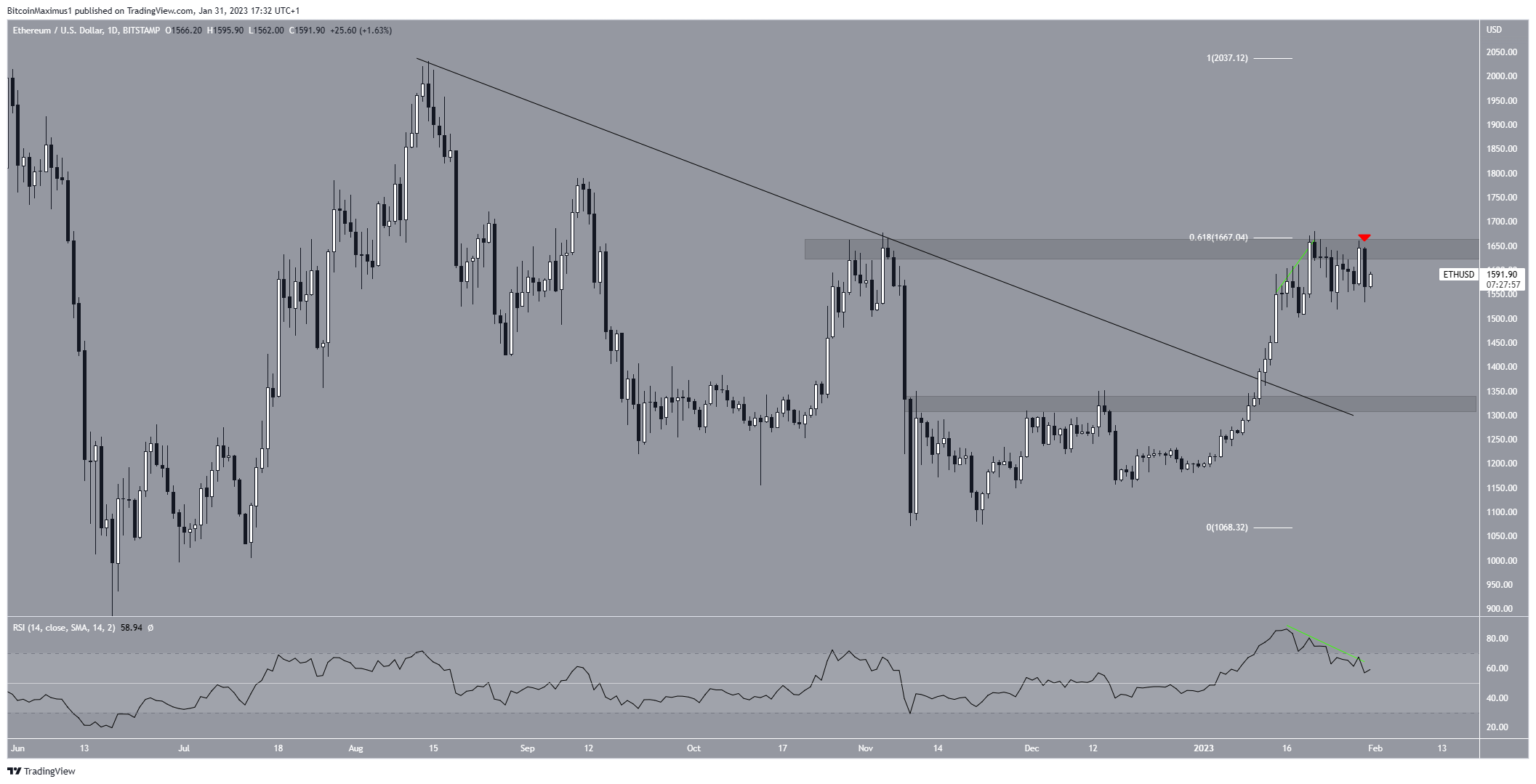 O Ethereum está em alta desde o início do ano. Ao longo desse período, ele rompeu uma linha de tendência de baixa e da área de resistência de US$ 1.350. Depois disso, o ETH atingiu um topo de US$ 1.680 em 21 de janeiro.