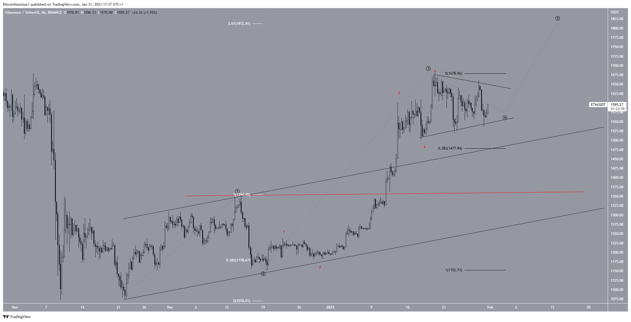 Existem duas possibilidades para o restante da onda quatro. A mais provável é que o ETH se consolide dentro de um triângulo simétrico nas próximas 24 horas antes de romper. Posteriormente, a meta principal seria de US$ 1.810, criada pela extensão de 2,61 da onda um (branca).