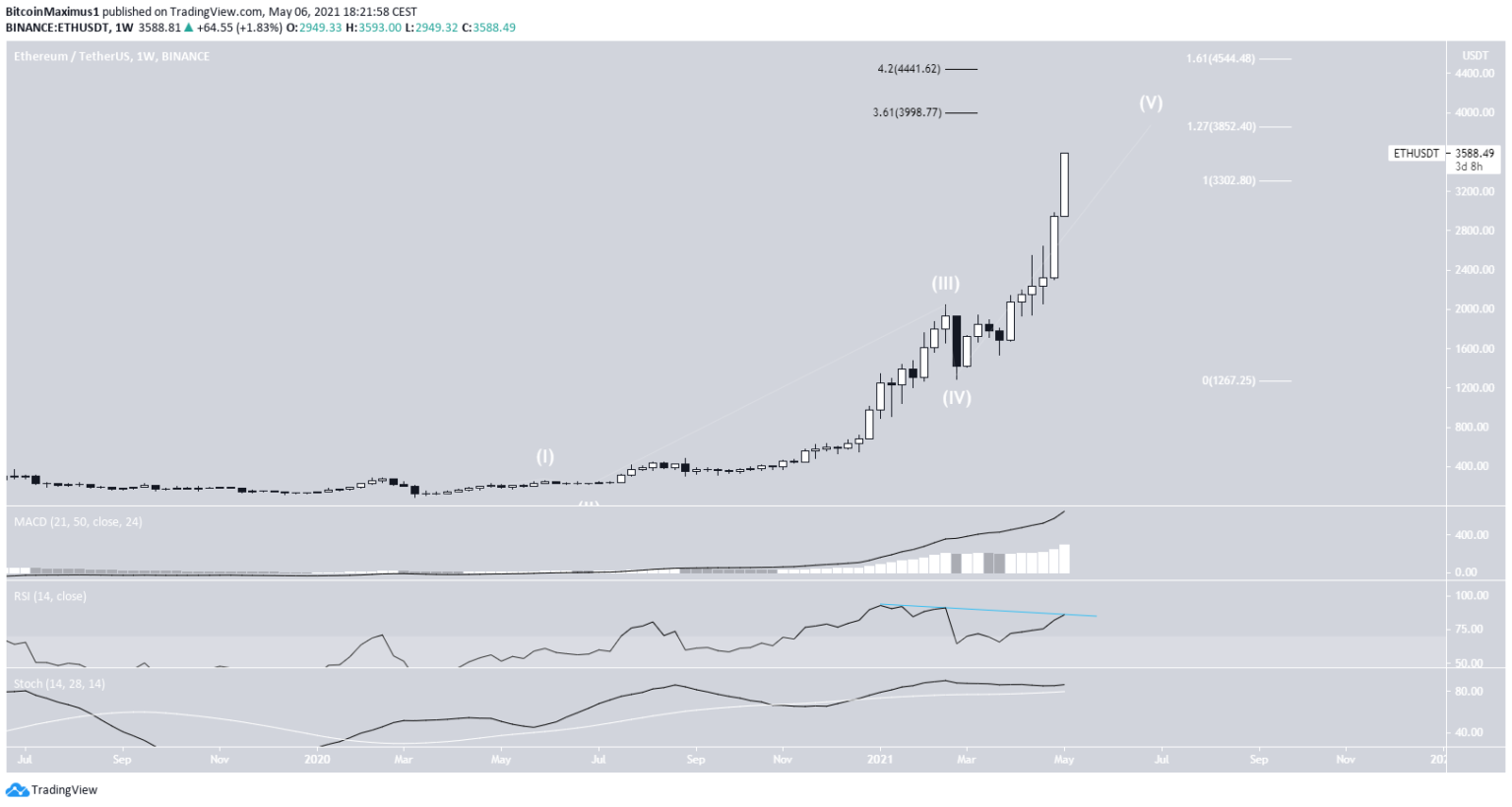 A ETH está provavelmente em sua quinta e última onda de movimento de alta. Apesar do aumento parabólico, a tendência ainda não mostrou qualquer sinal significativo de fraqueza.