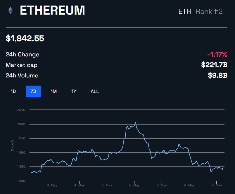 O Ethereum acumula queda de 1,2% nas últimas 24 horas, caindo para US$ 1.842 no fechamento deste artigo. O token tocou US$ 2.000 brevemente no fim de semana, mas a resistência se mostrou forte demais.
