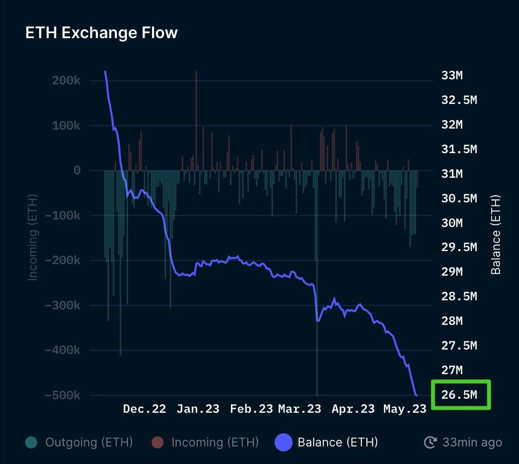 Desde o início do ano, a quantidade de ETH nas exchanges caiu cerca de 10%. Além disso, houve um êxodo maciço após o colapso da FTX no final de 2022.