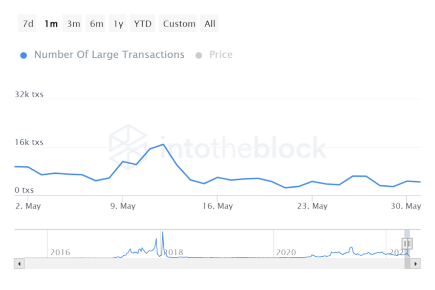 Em maio, o número de grandes transações envolvendo ETH atingiu um pico de 16.950 a um preço de US$ 1.947 em 12 de maio.